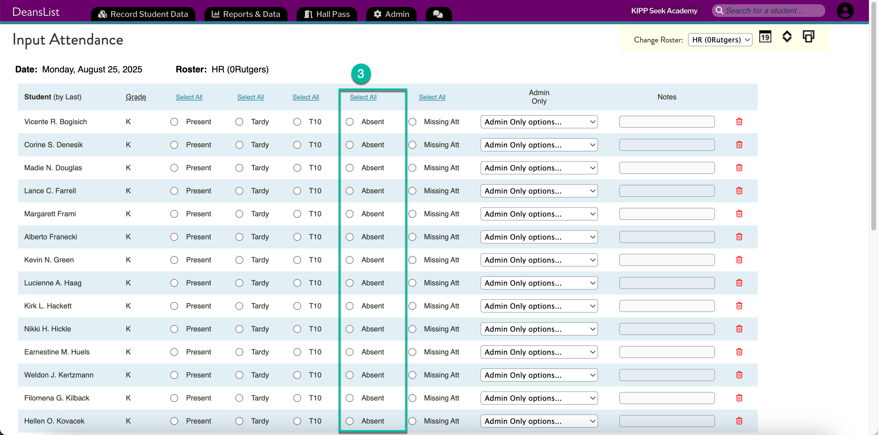 - Click Select All to fill down for all students, and click on any attendance code to change the student’s record