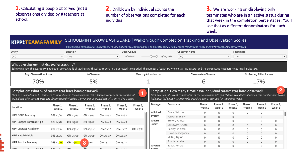 - Walkthroughs tab: What is the completion rate for Walkthrough observations each week, and what are the average scores? Who are the top ten and bottom ten teachers? Which teachers are meeting the monthly goal?