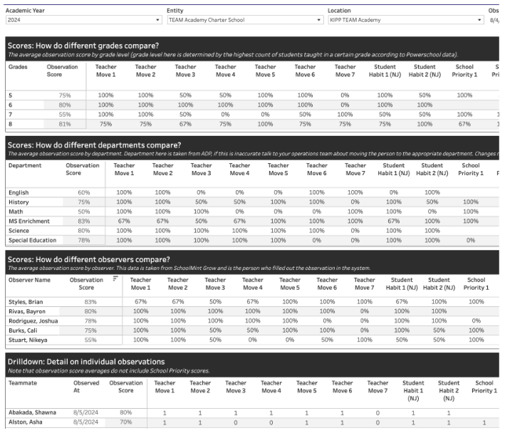 Averages scores averaged across the observation and by individual indicator by grade, department, coach and individual teacher.