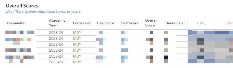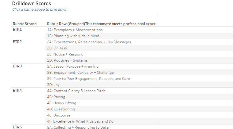 - Individual Overall Scores and Drilldown Scores: An individual teacher's weighted average, and their scores on each metric.