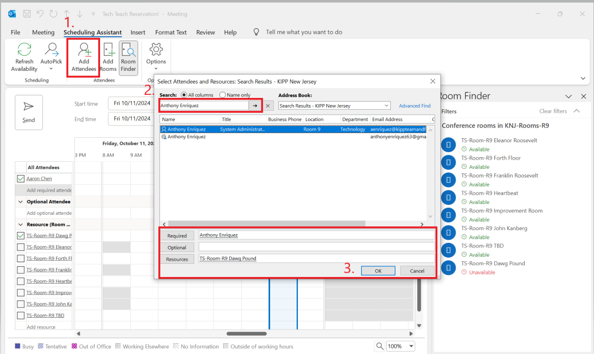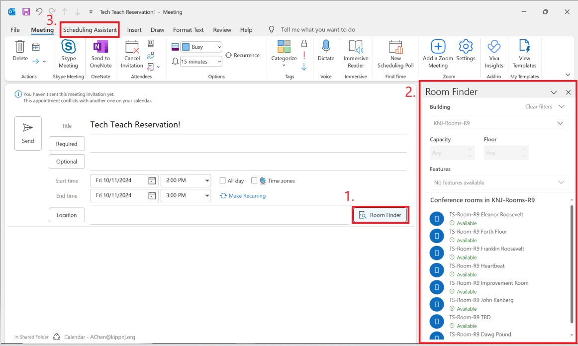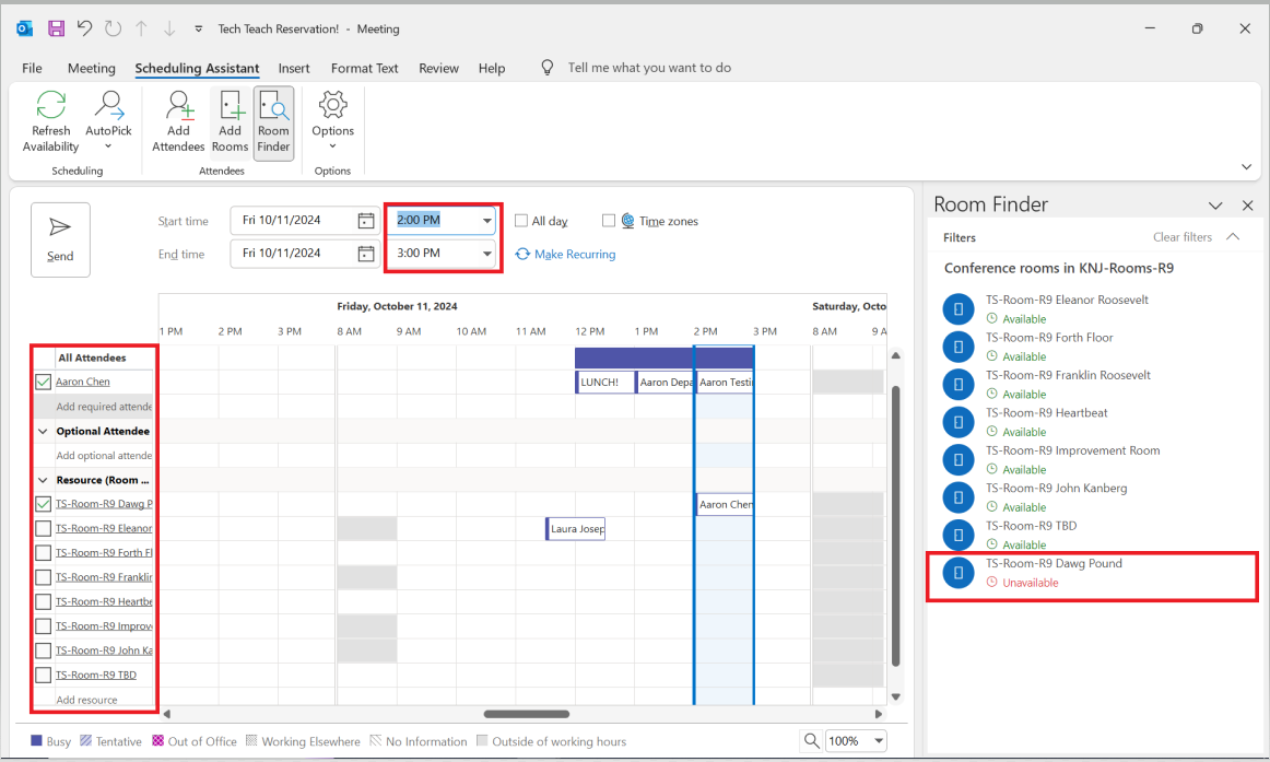 - Conference rooms for KNJ-Rooms-R9 will be displayed. Select the room you want to reserve, followed by any invitees. To view a room's availability, navigate over to "Scheduling Assistant" and select the room(s) to display its schedule.