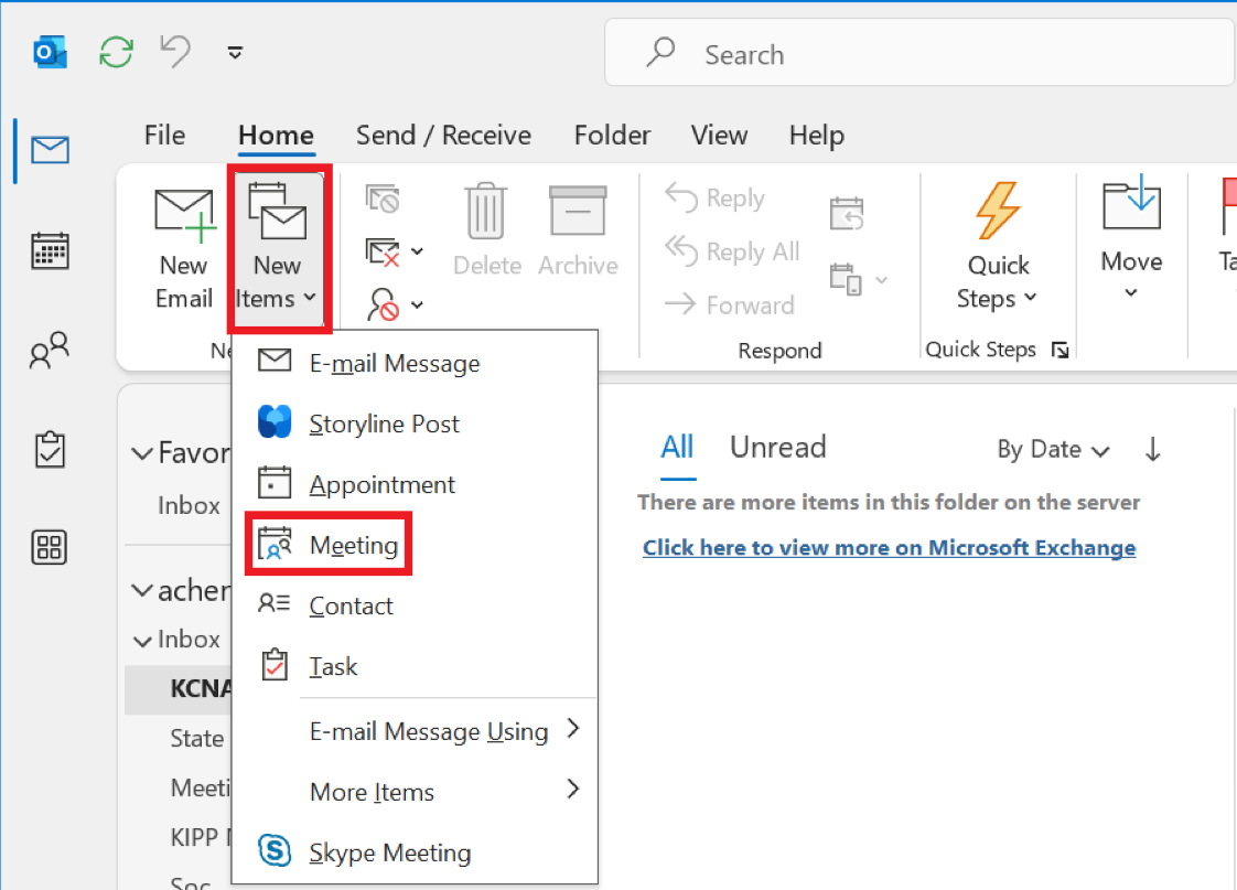1. To create a new meeting, go to the Home tab and select New Items > Meeting (Ctrl + Shift + Q), or on Calendar view right-click the desired date and select New Meeting Request.