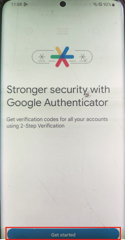 - Tap "Get started" on the "Stronger security with Google Authenticator" welcome screen.