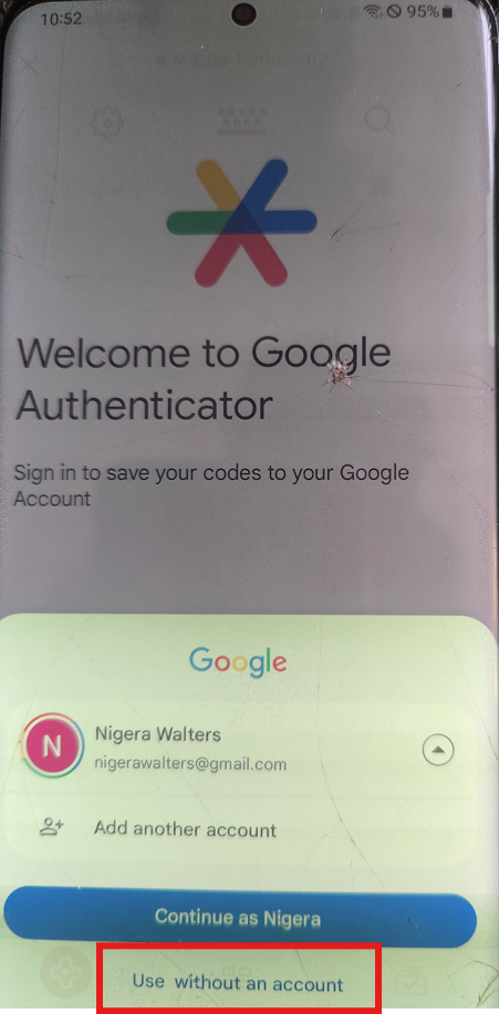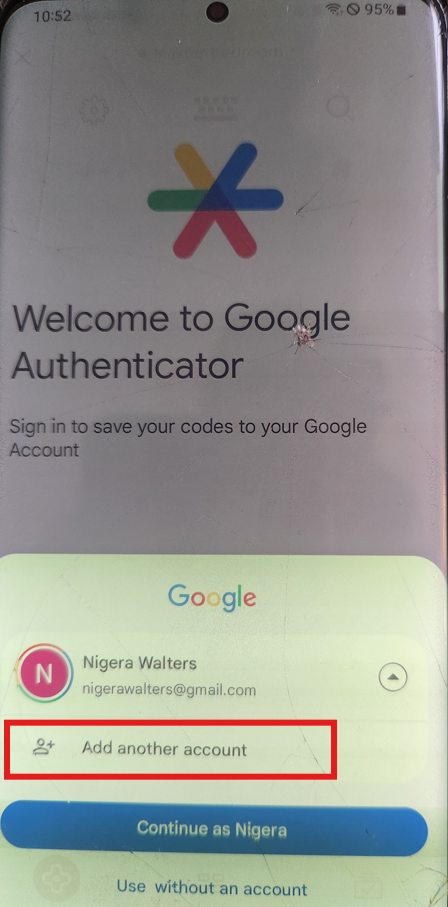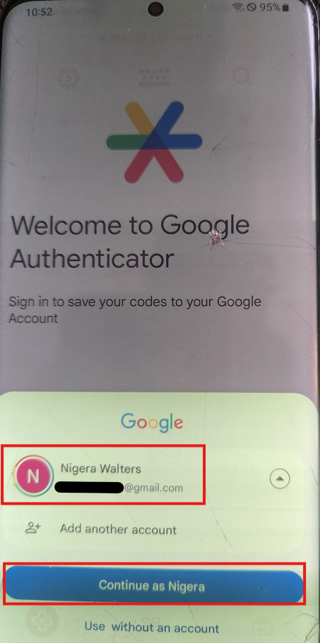 Continue as (current Google account): Allows you to use your personal account to store authenticator codes.