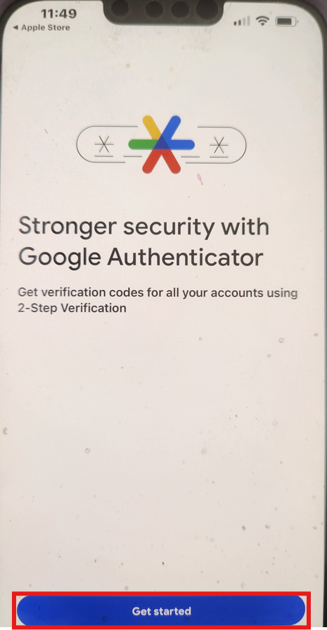 Tap "Get started" on the "Stronger security with Google Authenticator" welcome screen.