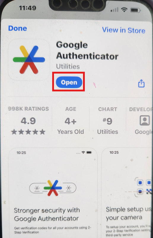 Tap “Open” when the authenticator installation is complete.