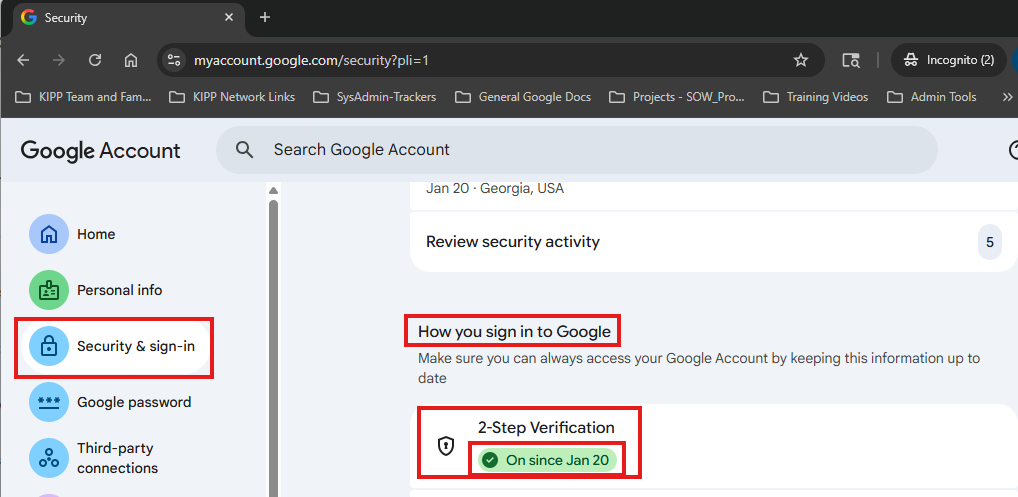 - Open your Google Chrome Browser and navigate to https://myaccount.google.com/security.