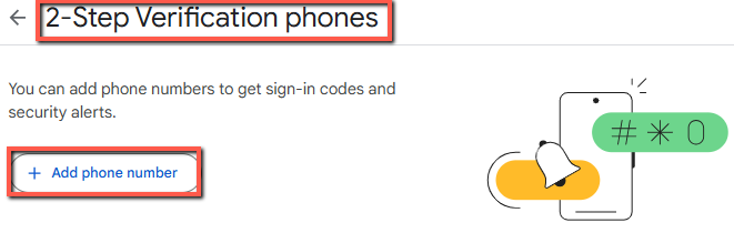 Click “+ Add phone number” under the “2-Step Verification phones” section.