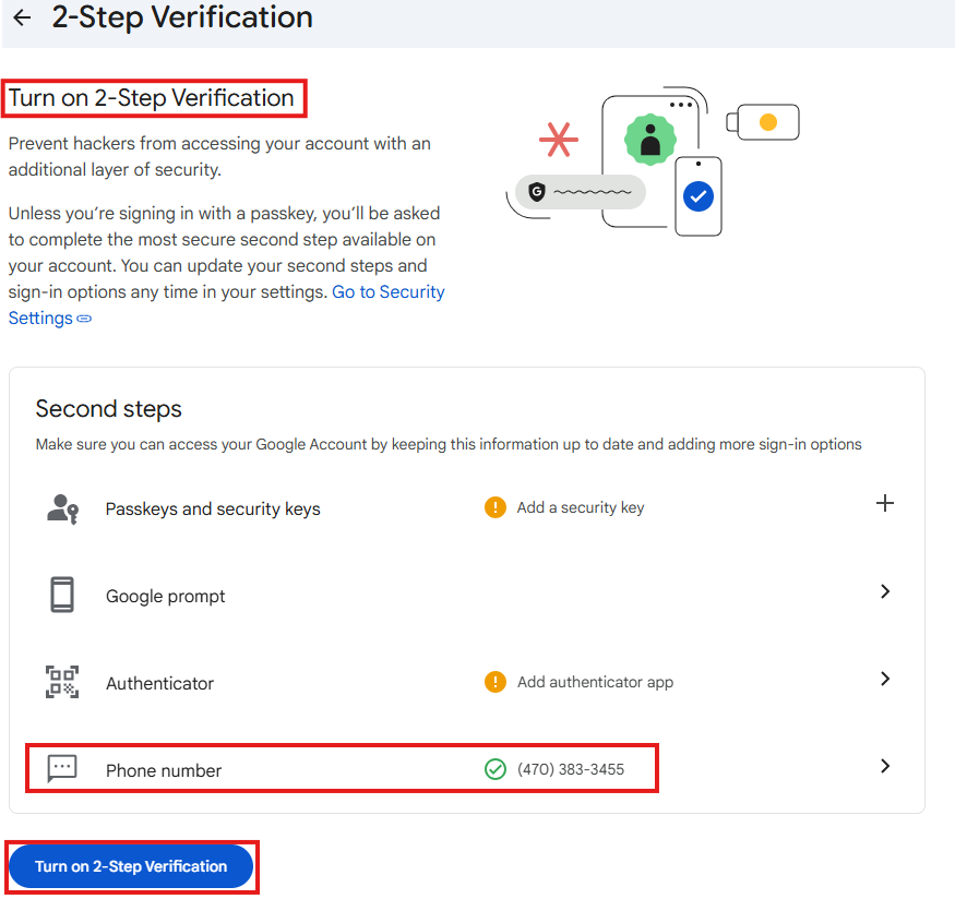 Verify that your phone number is correct and click "Turn on 2-Step Verification" on the "Turn on 2-Step Verification" page.
