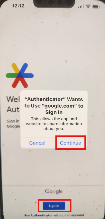 Tap "Sign in" and tap "Continue": Allows you to use your personal Google account (@gmail.com) or work account (@apps.teamschools.org or @kippmiami.org Google account) to store authenticator codes.